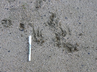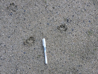 9月21日(日) やっと秋らしく朝は涼しくなりました。社殿の横の昨夜の雨で柔らかくなった土の上に、足跡が残っていました。爪痕のような跡は、一瞬、ここにも町中の熊がと思ったのですが。その大きさから、アナグマかアライグマかも知れません。ちなみにアナグマには神社下の側溝で遭遇したことがあります。