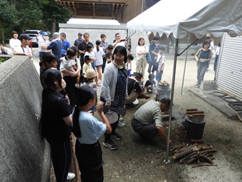 8月31日(日)秋祭りの前夜祭で、今年は避難訓練を兼ねて羽釜でご飯を炊いて、おにぎりを作ってみたいと考えています。そこで、事前練習で羽釜でご飯を炊いて、おにぎりを作りました。おこげもなく上手に出来ました。おいしいおにぎりが出来、本番が楽しみになりました。