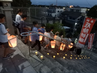 10月18日(土)前夜祭では、まず防災について川北さんを講師に学習をしました。その後、羽釜でご飯を炊き、おにぎりを食べました。夕刻には筒井子供会が灯籠をもって参拝しました。みんなで作ったランタンの階段を練り歩きました。