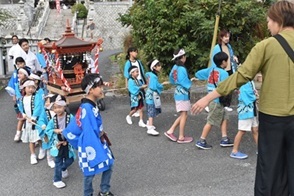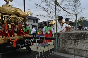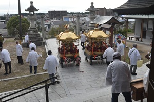 10月19日(日)予定通り秋祭りを催行できました。神事に続き、境内での舞台で巫女舞をおこない、島田川河畔の御旅所まで神輿行列です。子供神輿も元気なかけ声で参加しました。神社に神輿が帰り、後片付けが終了すると同時に小雨になりました。今年も主要行事を天候に恵まれて終えることが出来ました。