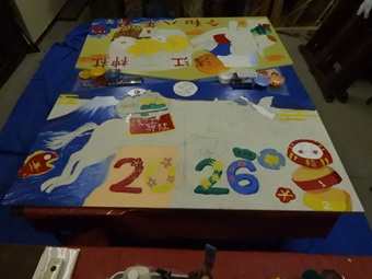 11月3日(月:文化の日)11月は浅江中学校の文化祭があるため、大型絵馬の製作は一休みになります。12月からの作業が楽しみです。今年から2チームで2枚の大型絵馬を製作しています。