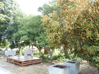 8月30日(土)暑い日が続いています。境内の金木犀の下にはベンチがあります。午前中はその日陰で、海からの風で涼しさを感じる時期になりました。また、やまももの木の下にはたくさんのやぶらんが咲いています。