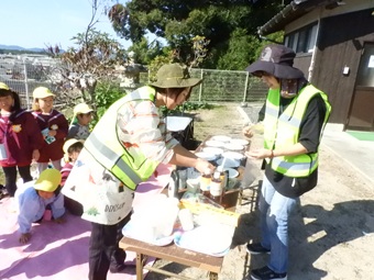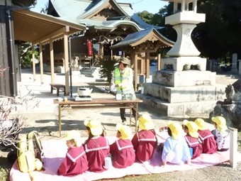 11月7日(金)汗實保育園の年長さん8名が七五三のお参りと、防災訓練を兼ねて参拝しました。防災訓練では、カセットコンロやお湯を入れるとご飯が炊ける非常食などを詰めたキャリーカートで園から持参しました。ご飯の炊ける間に園児は七五三の参拝をしました。先生のお話をしっかり聞いて、非常食で作ったおにぎりを上手に食べていました。